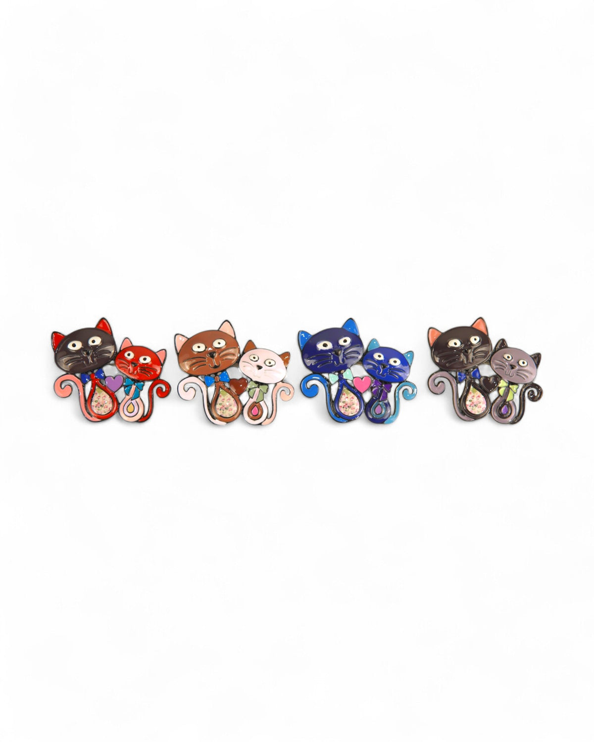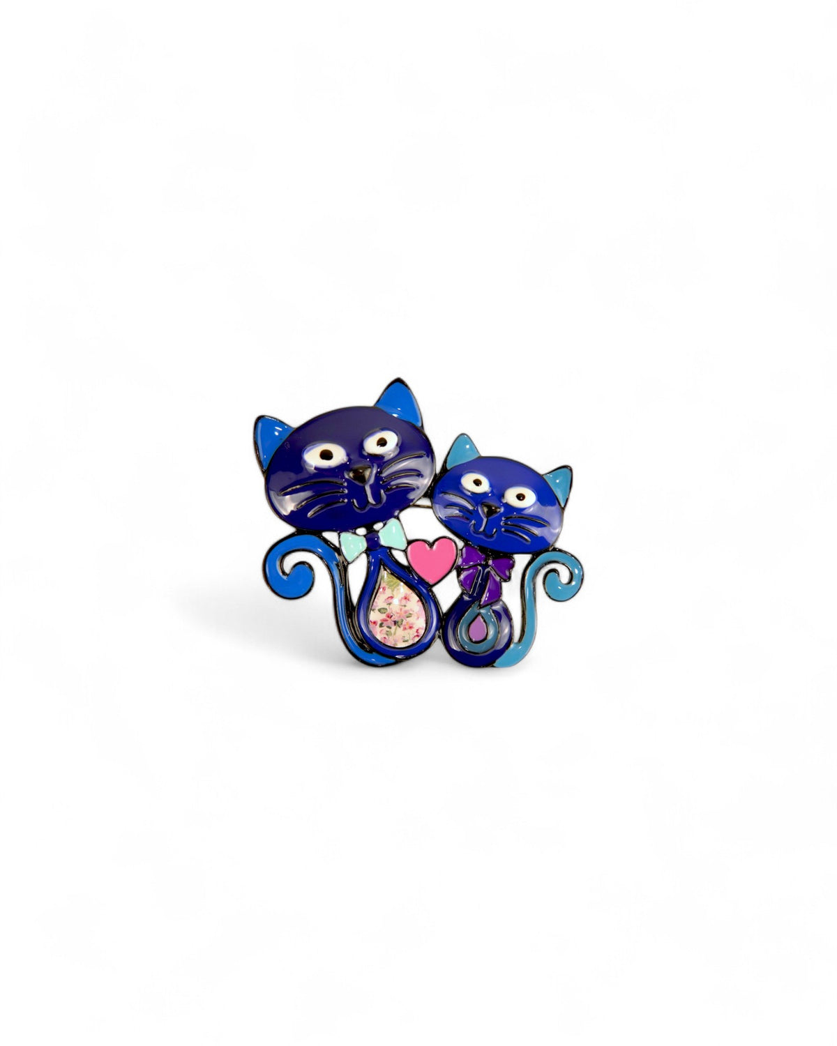 - DESIGN JUCĂUȘ: Broșă cu două pisici simpatice, decorate cu papioane și cozi în formă de spirale, ideală pentru iubitorii de pisici.