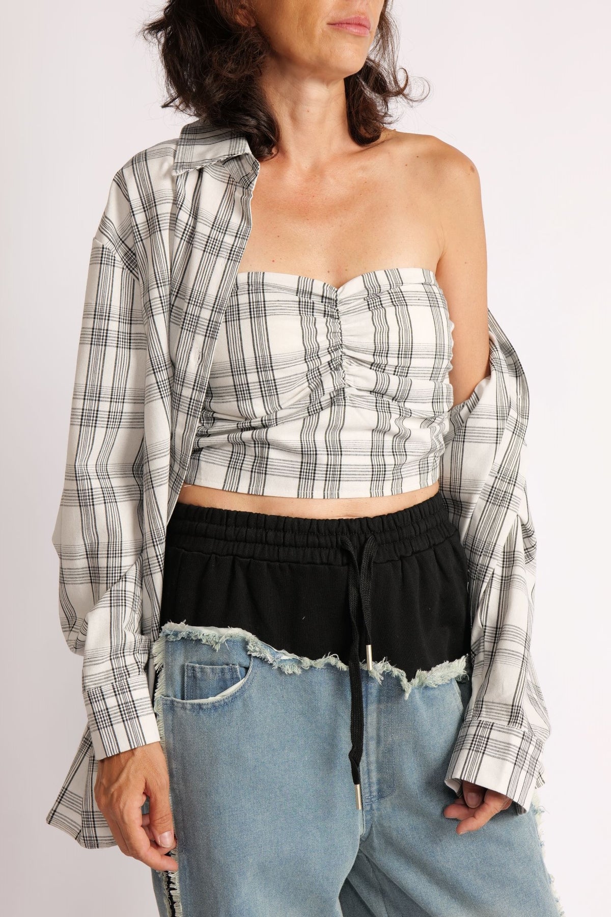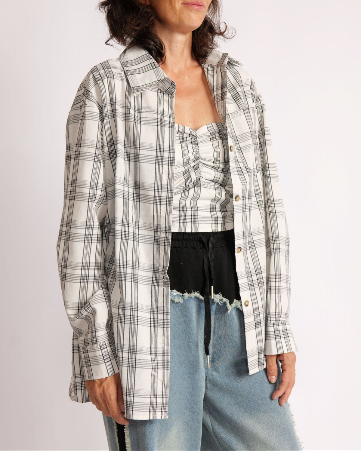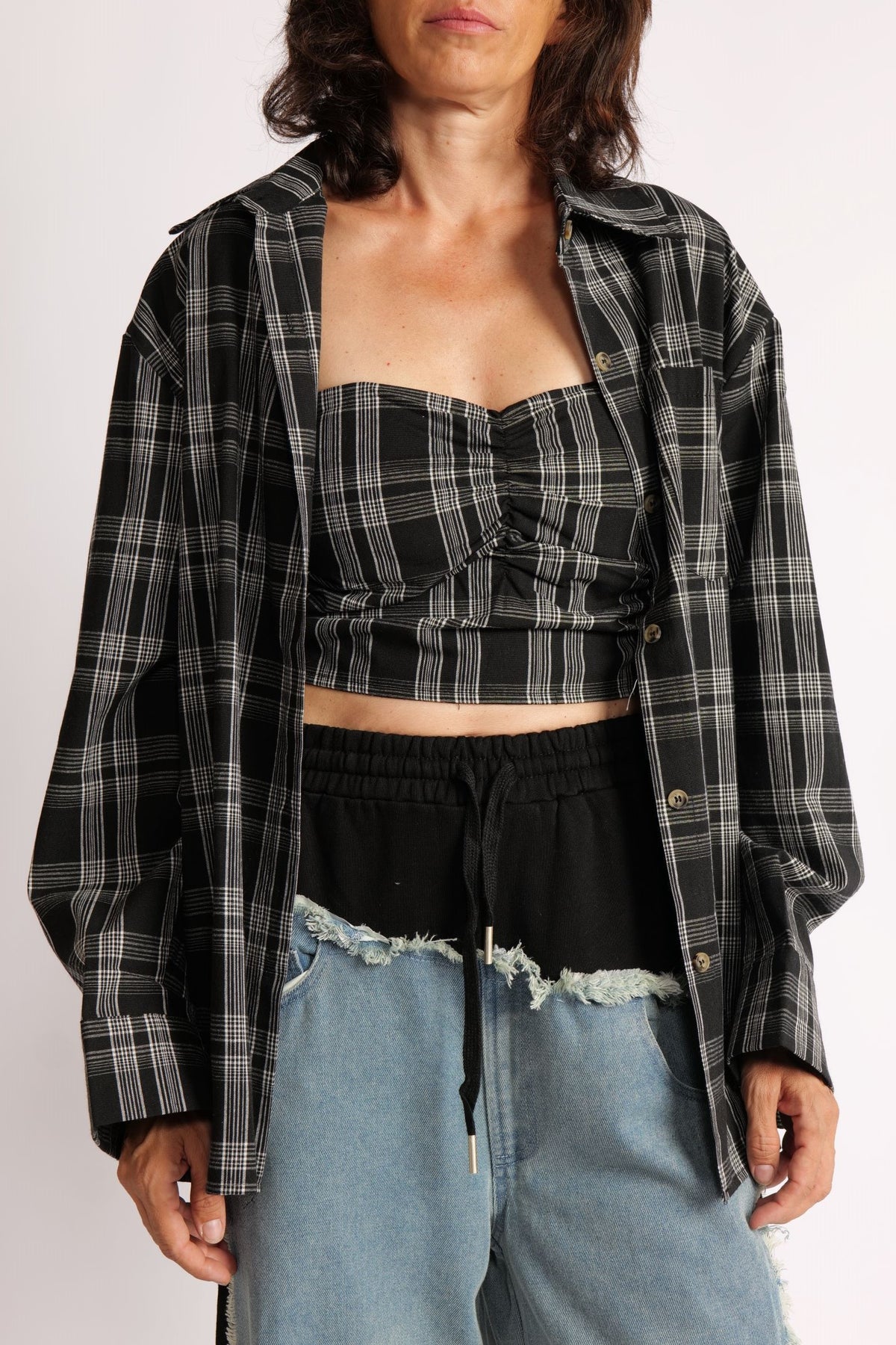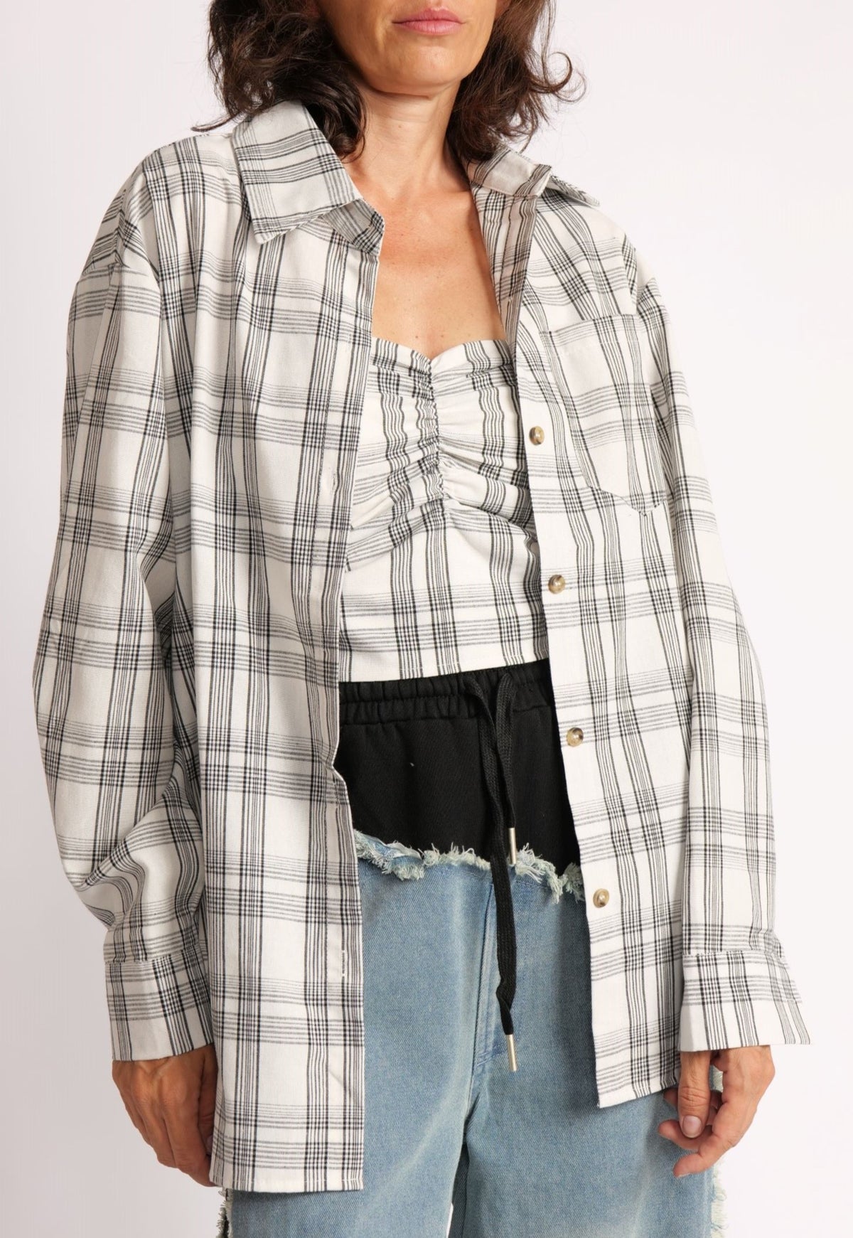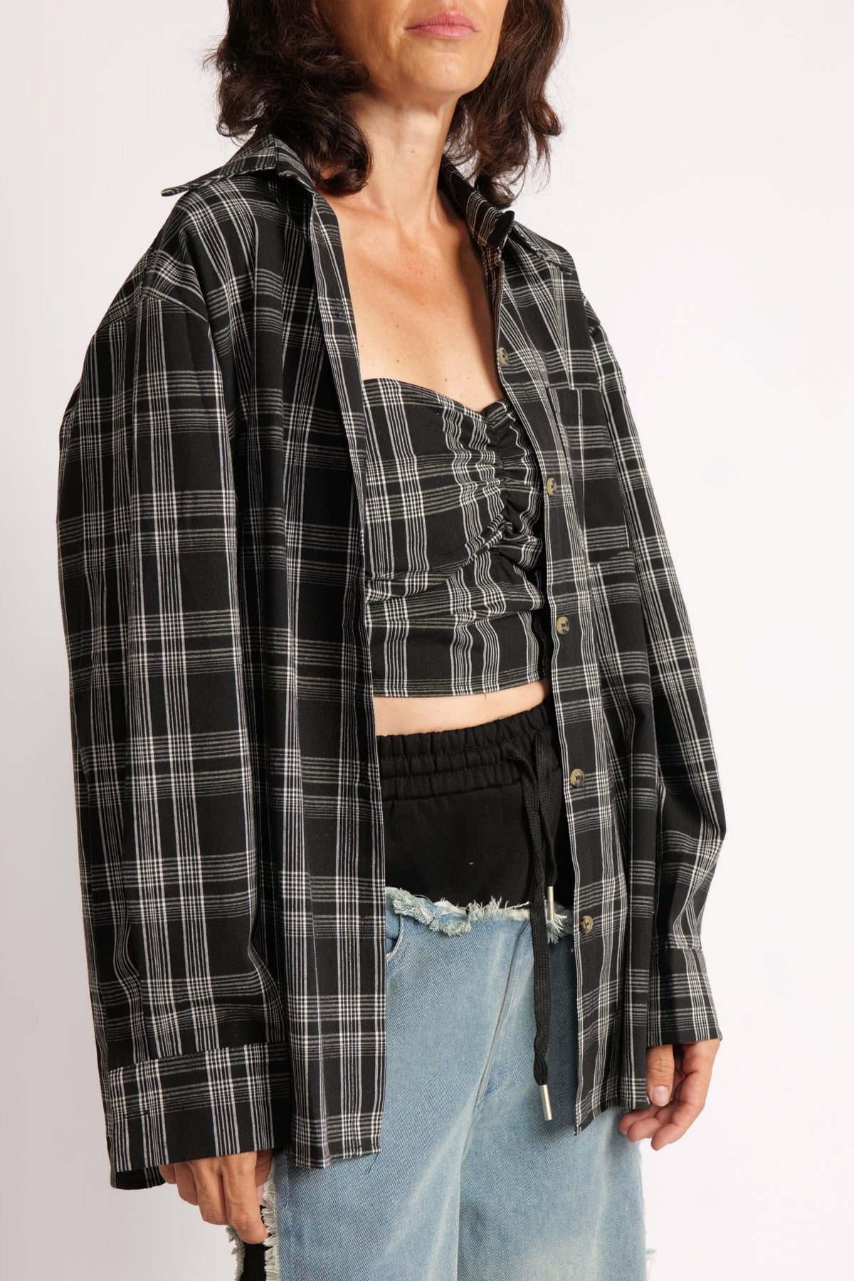 - STIL CONTEMPORAN: Cămașă oversize cu bustieră inclusă – un set urban relaxat și modern.