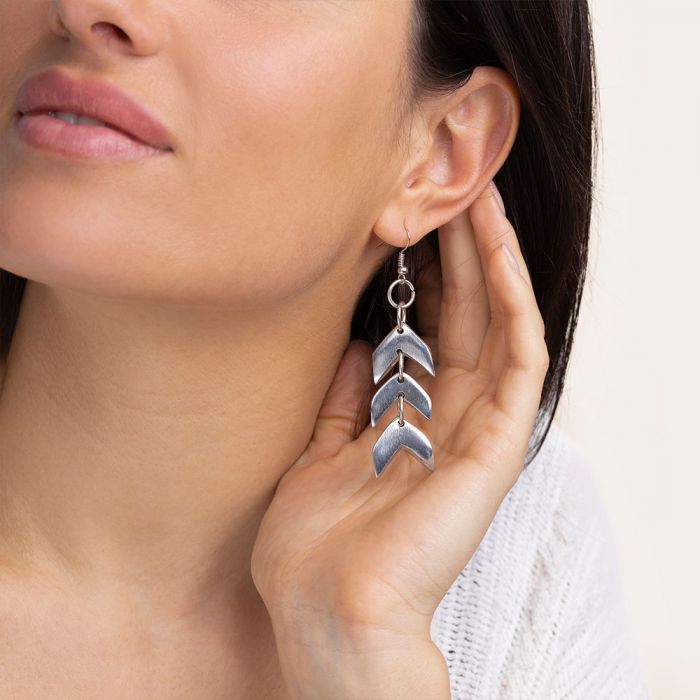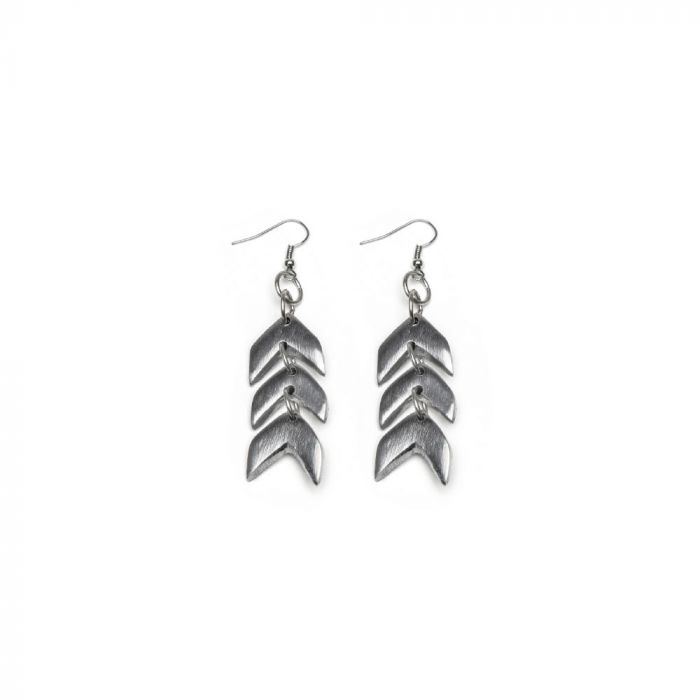 Cercei formați din trei săgeți orientate în sus. Lucrat manual din aluminiu 100% reciclat. Testat cu nichel. Dimensiune 4,5 cm. Mărimile pot fi supuse unor mici variații date de măiestria produsului.
