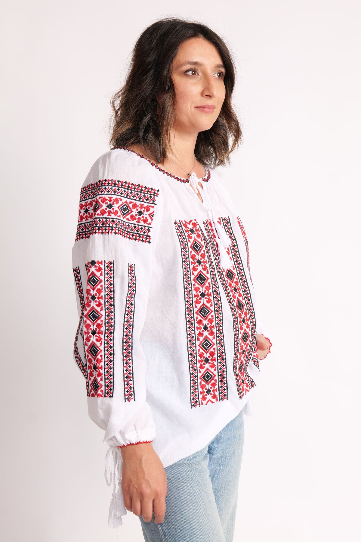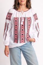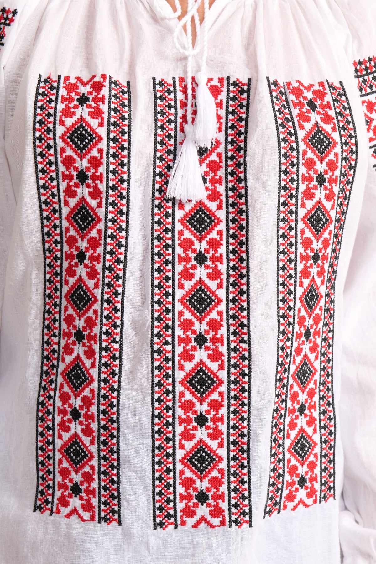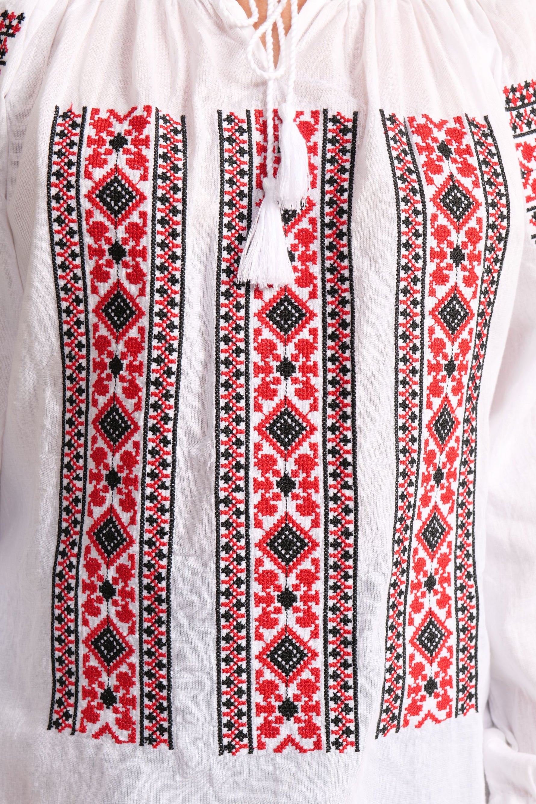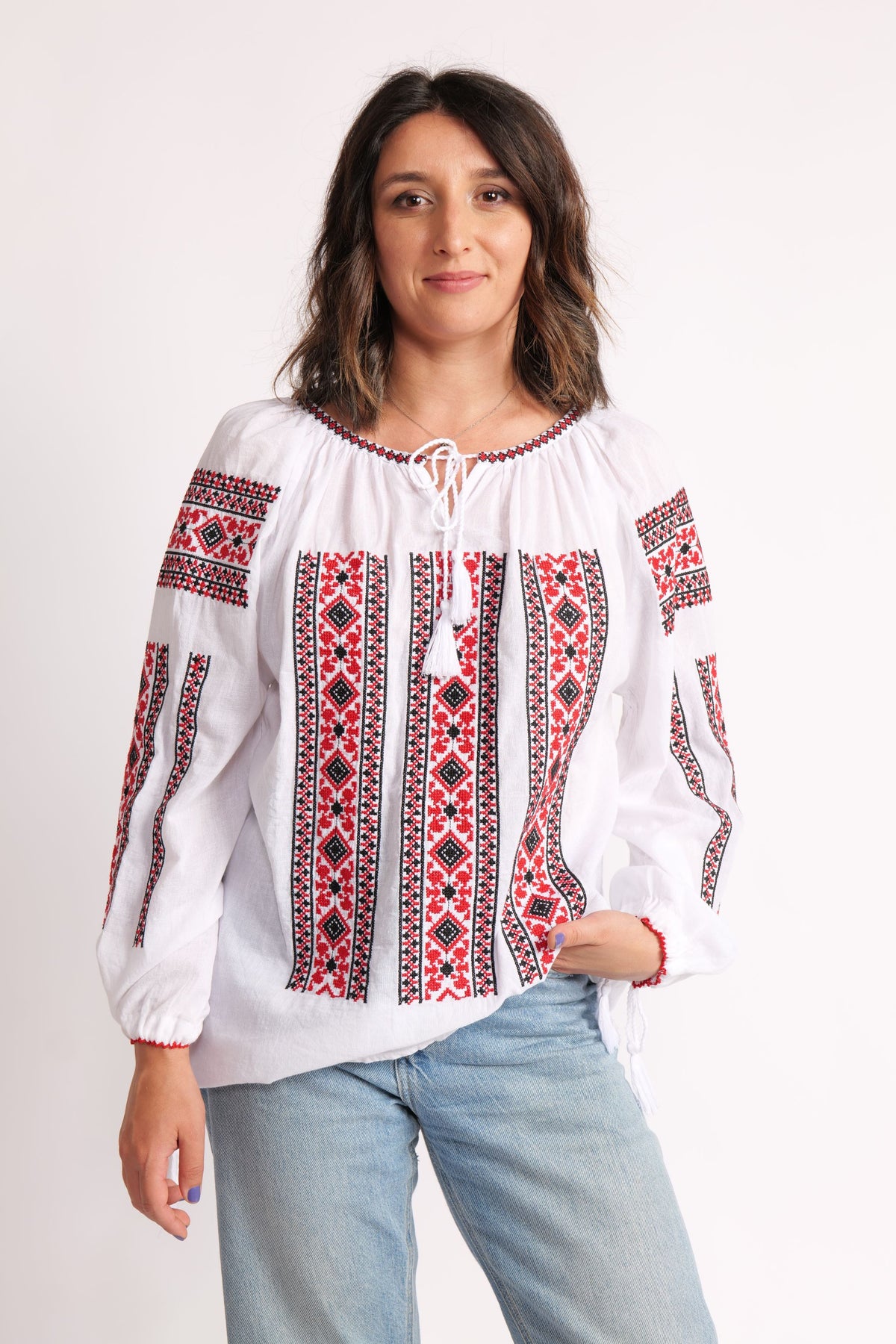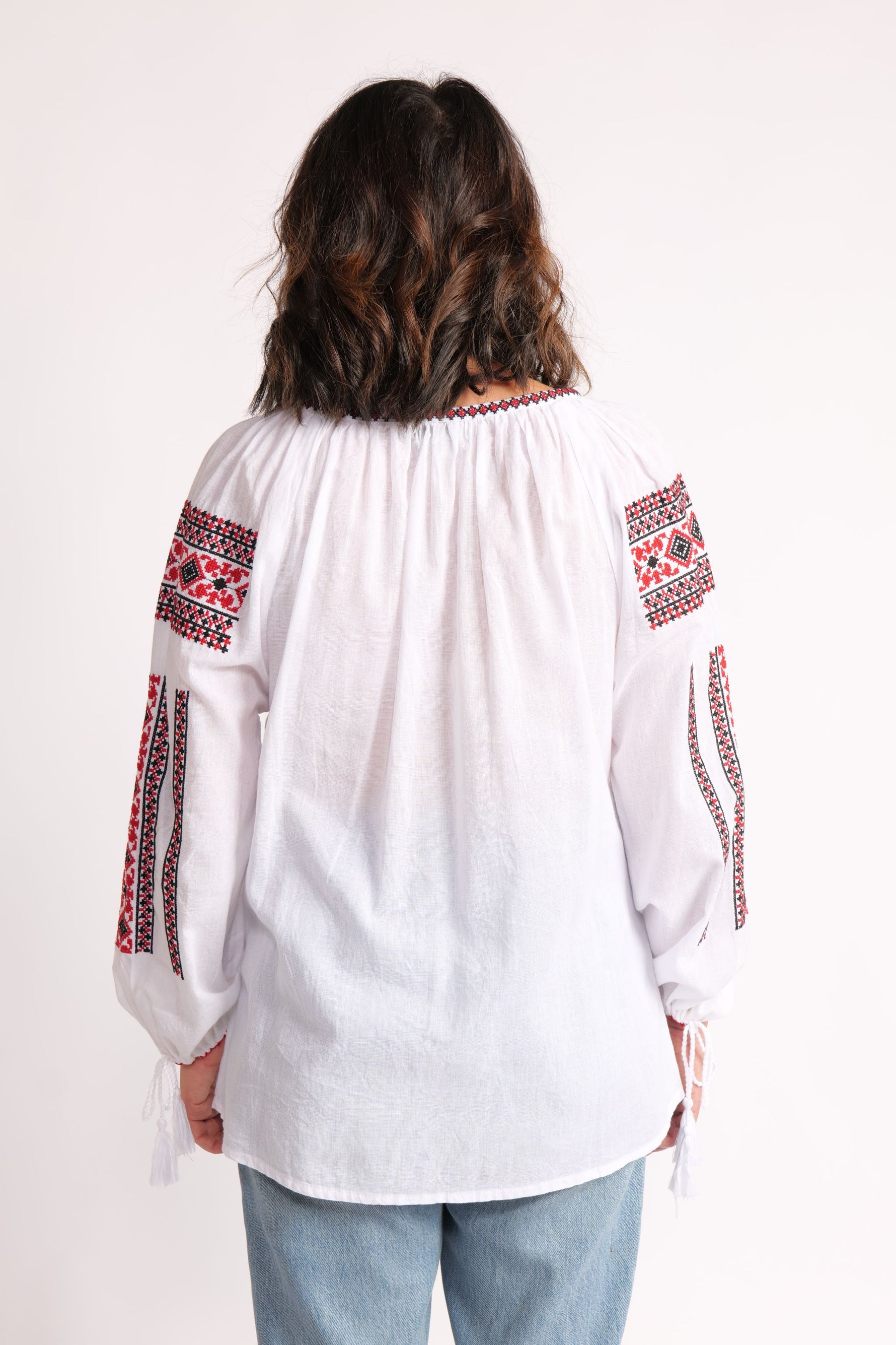 Cămașă cu motive etno, tip ie românească, confecționată din fibră naturală de bumbac 100%. Croială cu siluetă largă. Guler bărcuță. Șiret răsucit cu ciucuri pentru ajustare la guler și la mâneci. Broderie cu motive tradiționale, din fir roșu și negru, pe mâneci și frontal, pe centru. Motive cusute la terminațiile mănecilor și în jurul gâtului.