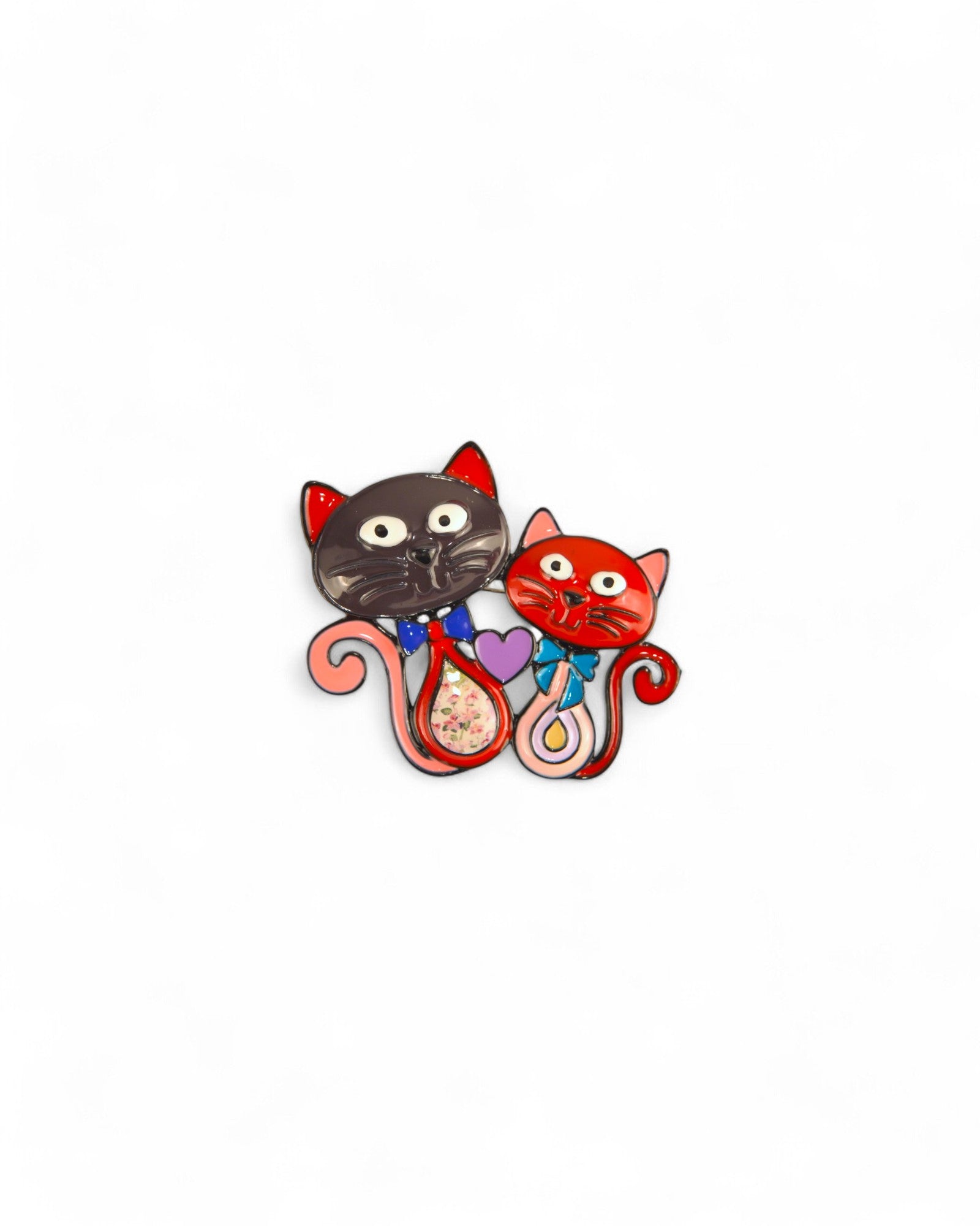 - DESIGN JUCĂUȘ: Broșă cu două pisici simpatice, decorate cu papioane și cozi în formă de spirale, ideală pentru iubitorii de pisici.