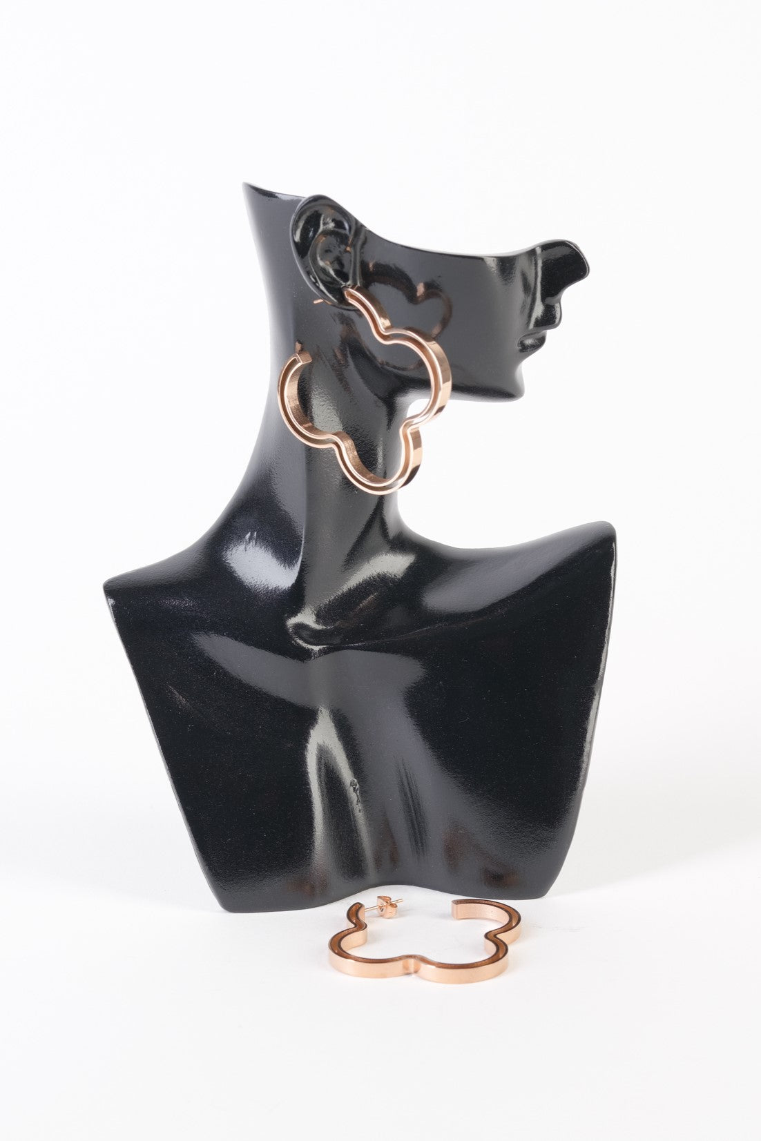 Cercei în formă de floare, cu ramă dublă, confecționați din oțel inoxidabil. Închidere cu șurub.