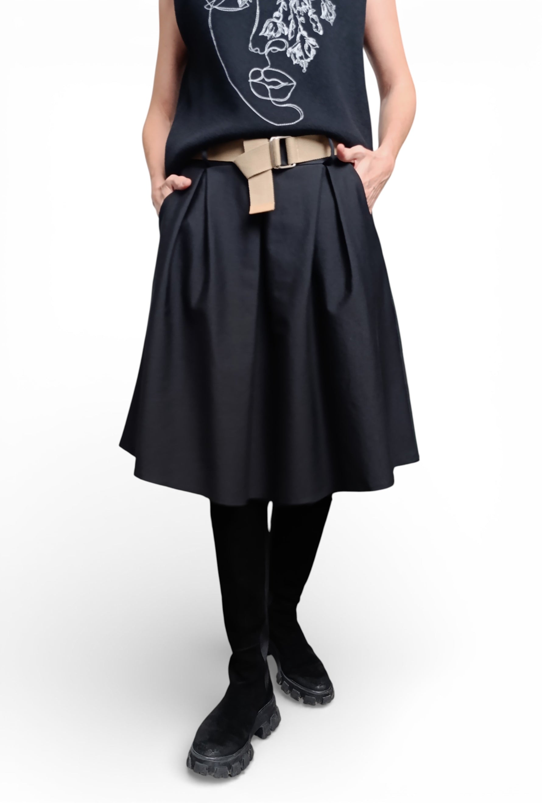 Design: Fustă midi cu croială evazată și pliuri frontale.