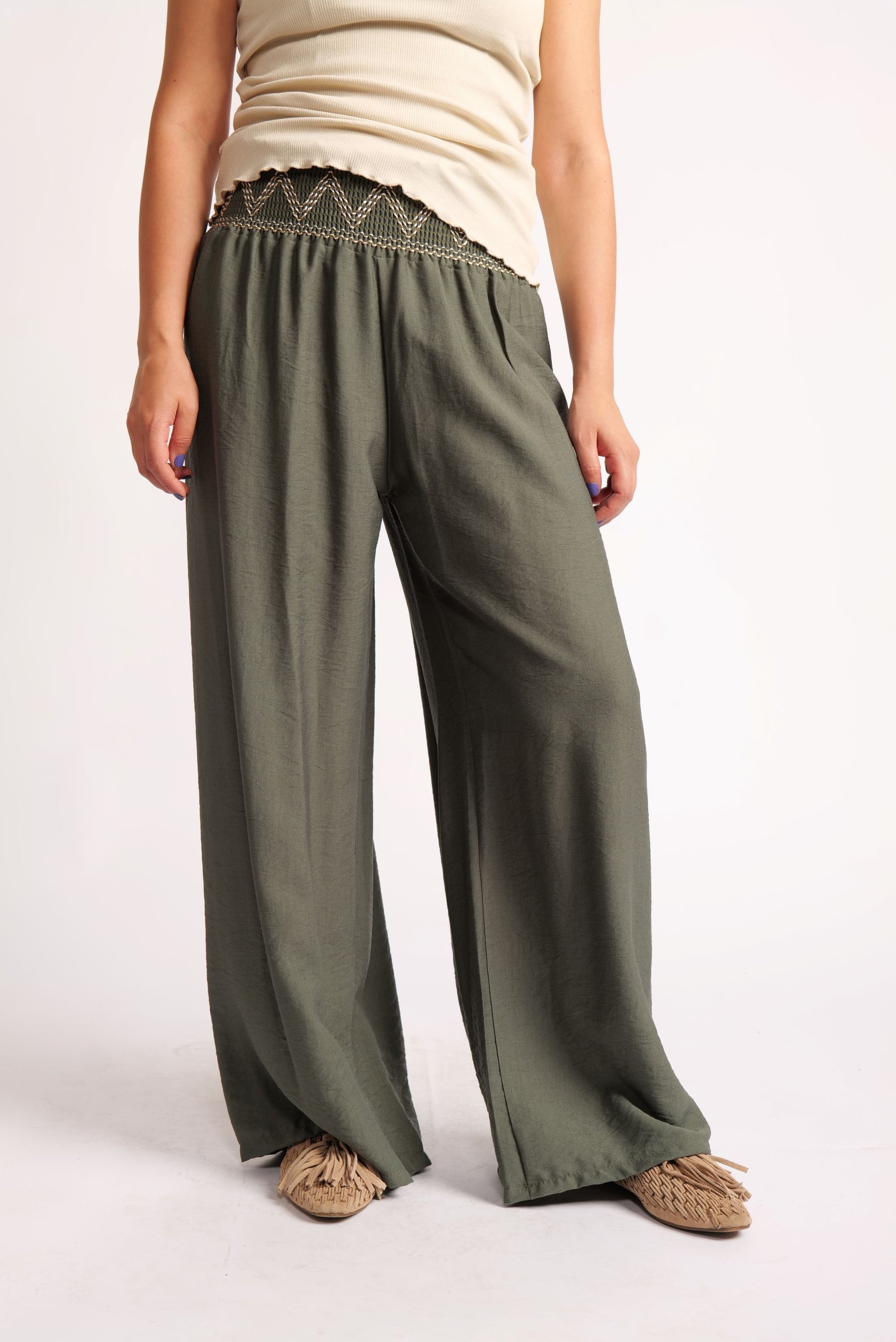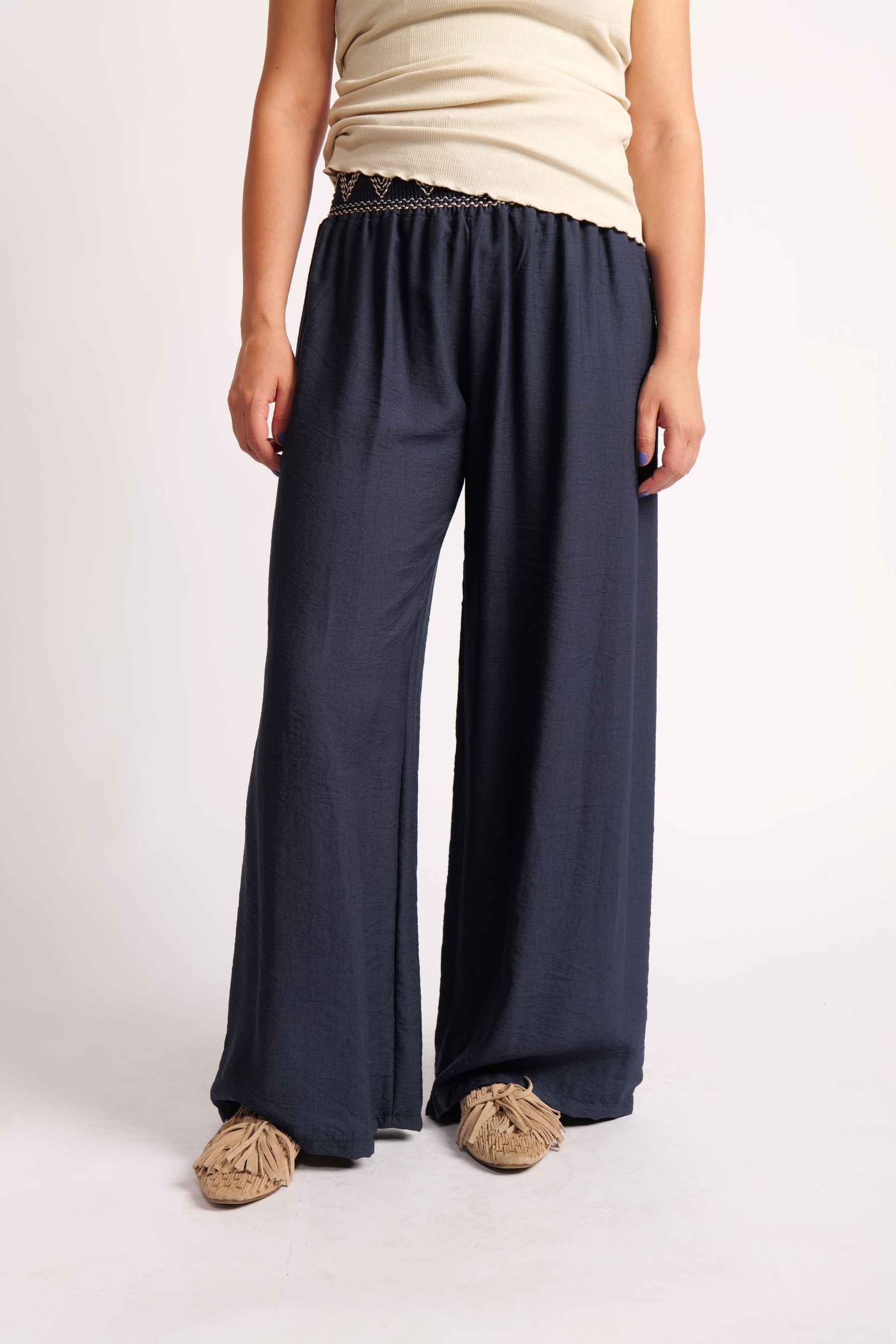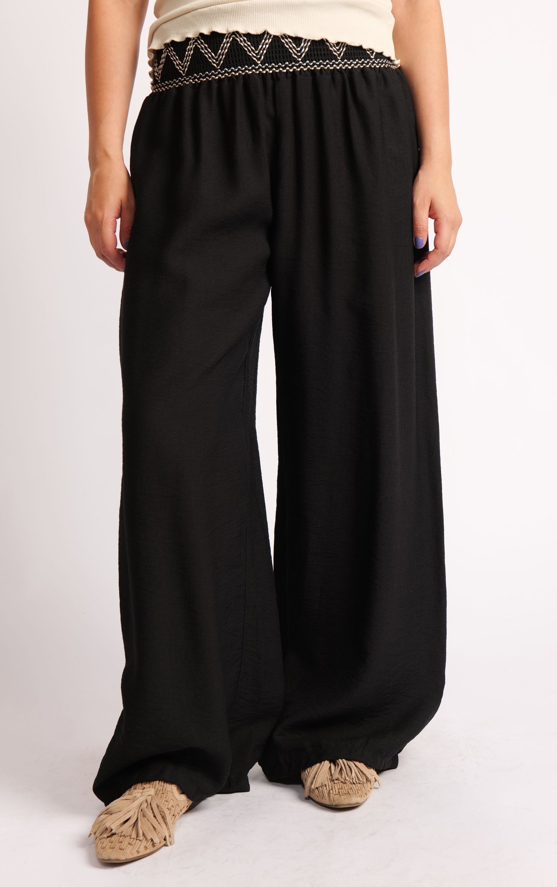 Pantaloni Largi Cu Betelie Brodată – Talie Înaltă și Cădere Fluidă