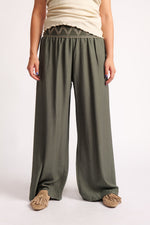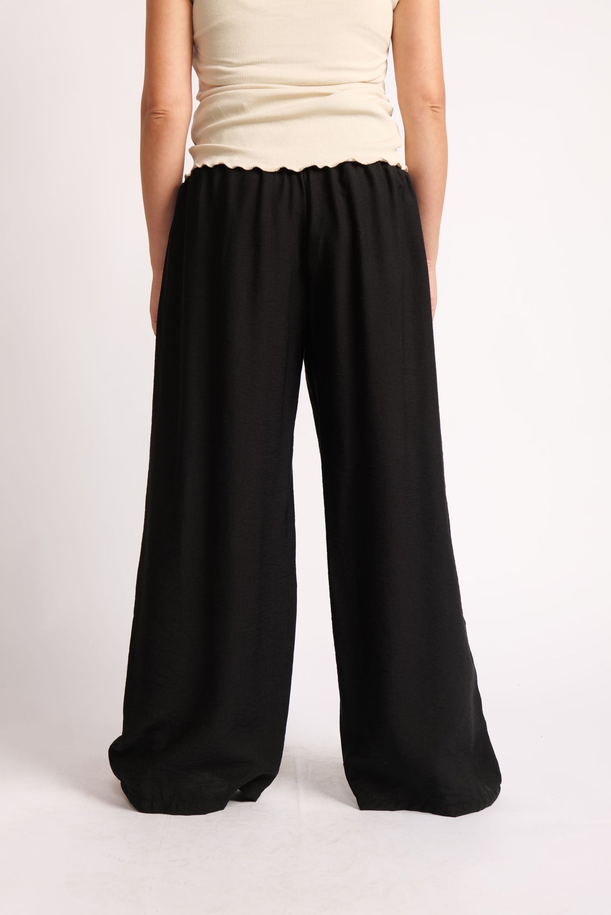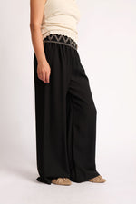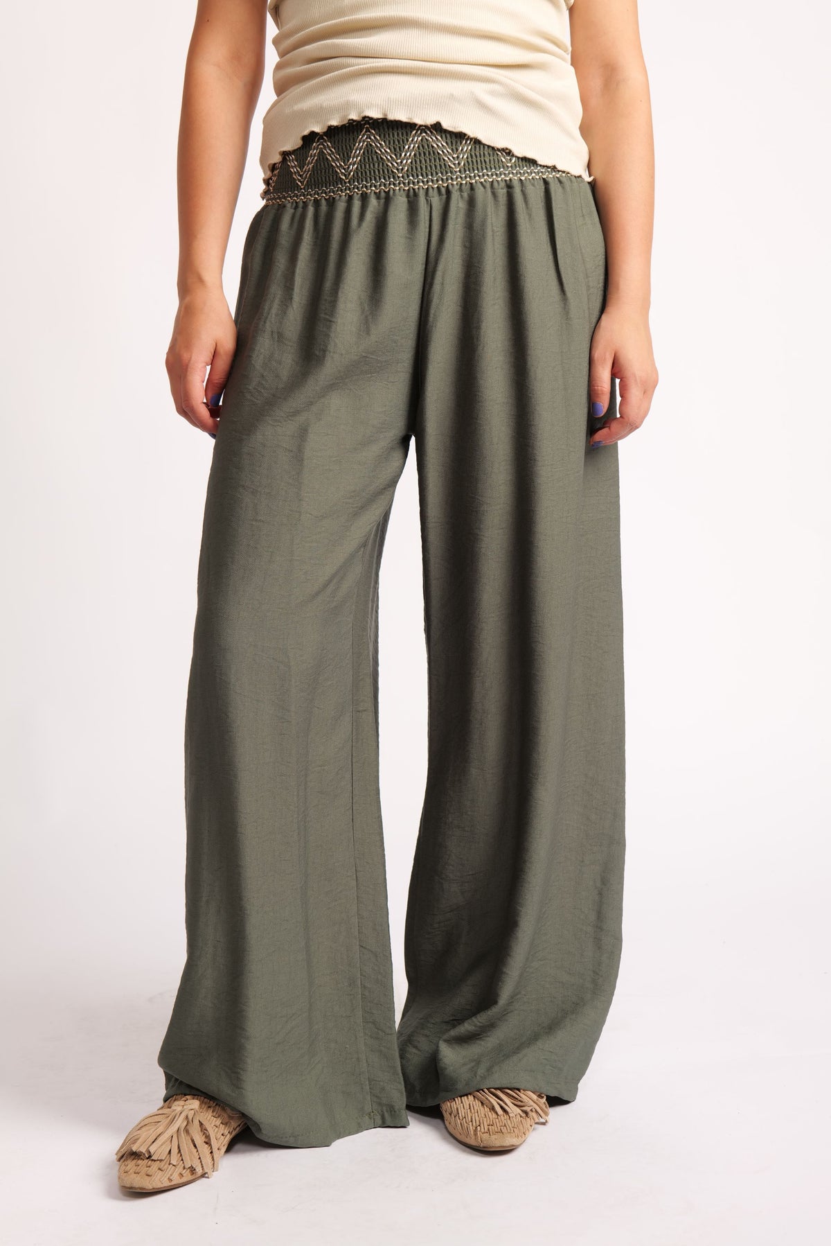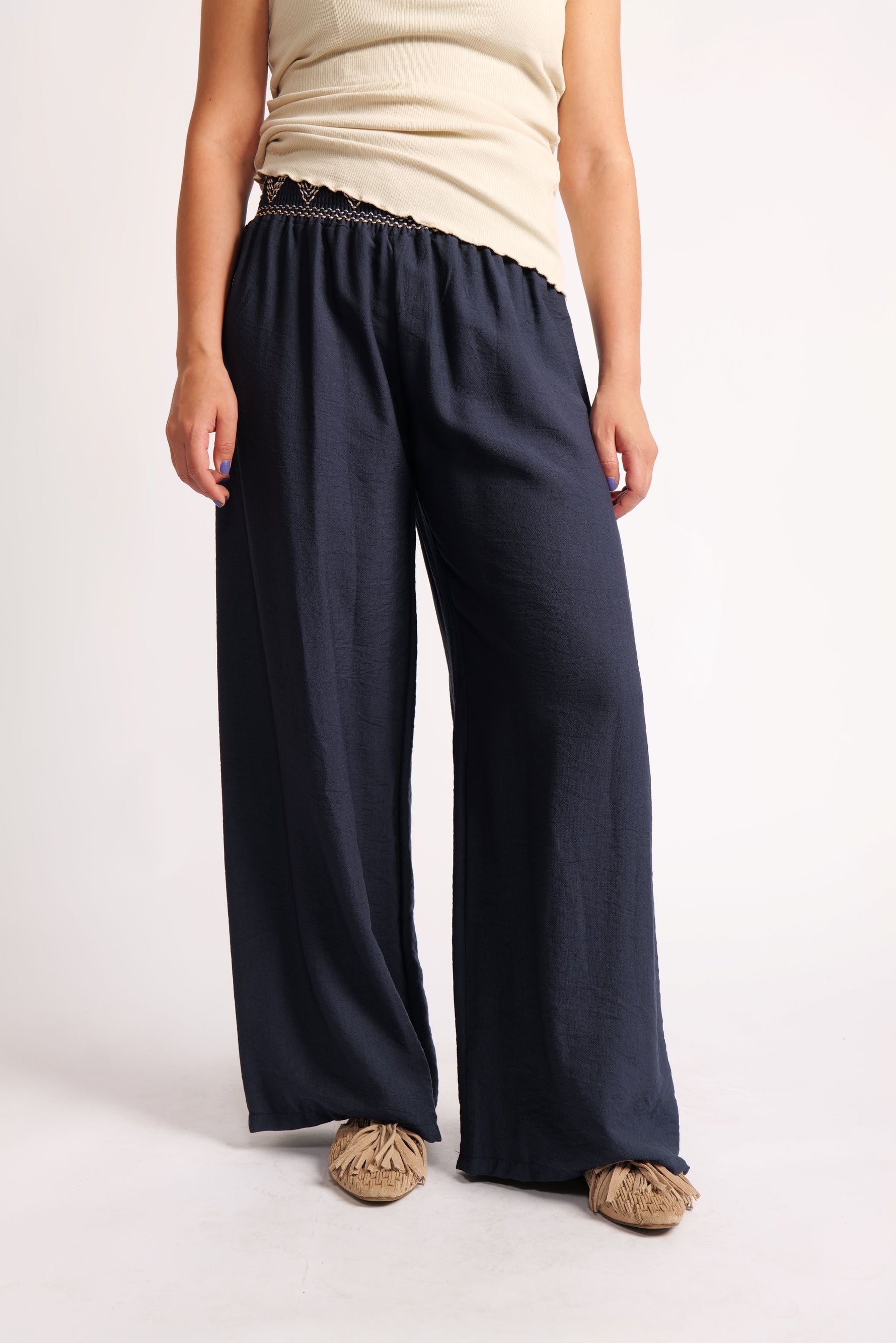 Pantaloni Largi Cu Betelie Brodată – Talie Înaltă și Cădere Fluidă