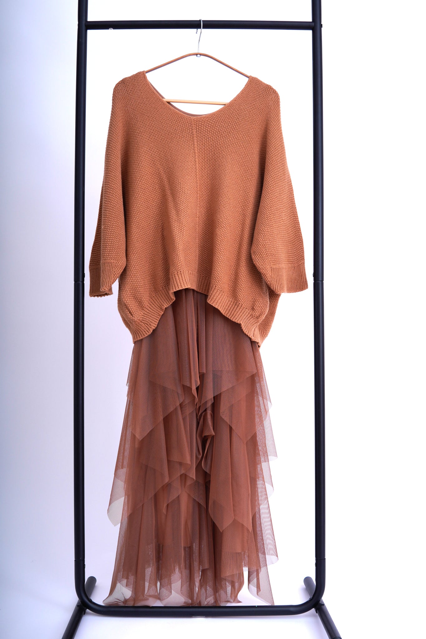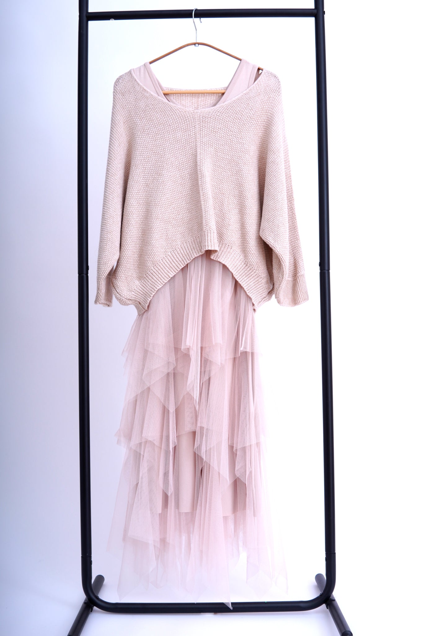 - Design: Set format din două piese – rochie din tul și pulover tricotat