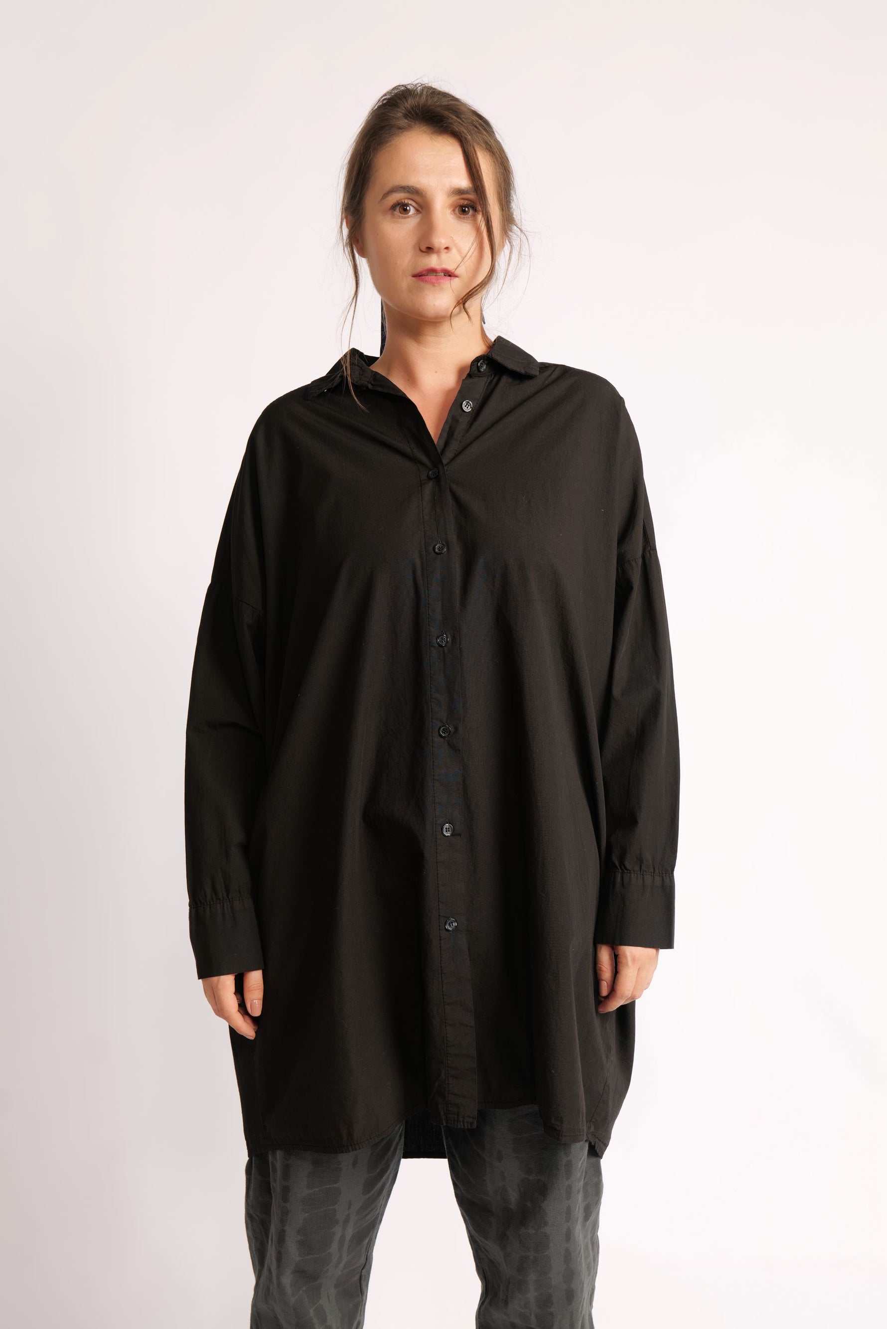 Cămașă lungă cu buzunare confecționată din bumbac 100%. Guler cu rever. Decolteu în V. Mânecă lungă. Manșetă cu deschidere și nasturi. Partea de jos rotunjită și asimetrică. Închidere frontală cu nasturi.