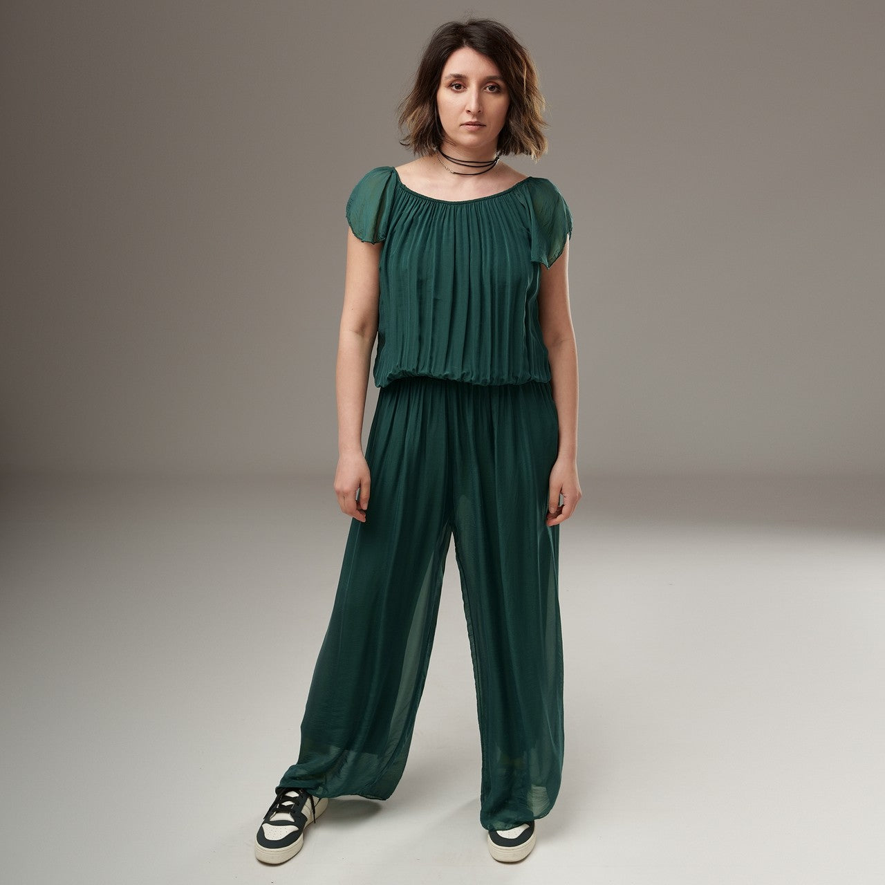 Salopetă Largă Din Mătase Cu Decolteu Elastic Și Volane