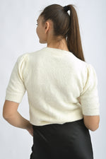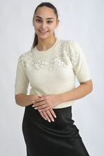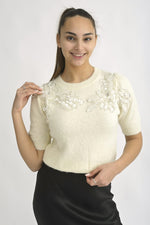 Pulover Pufos Cu Mâneca Scurtă Și Flori Din Paiete