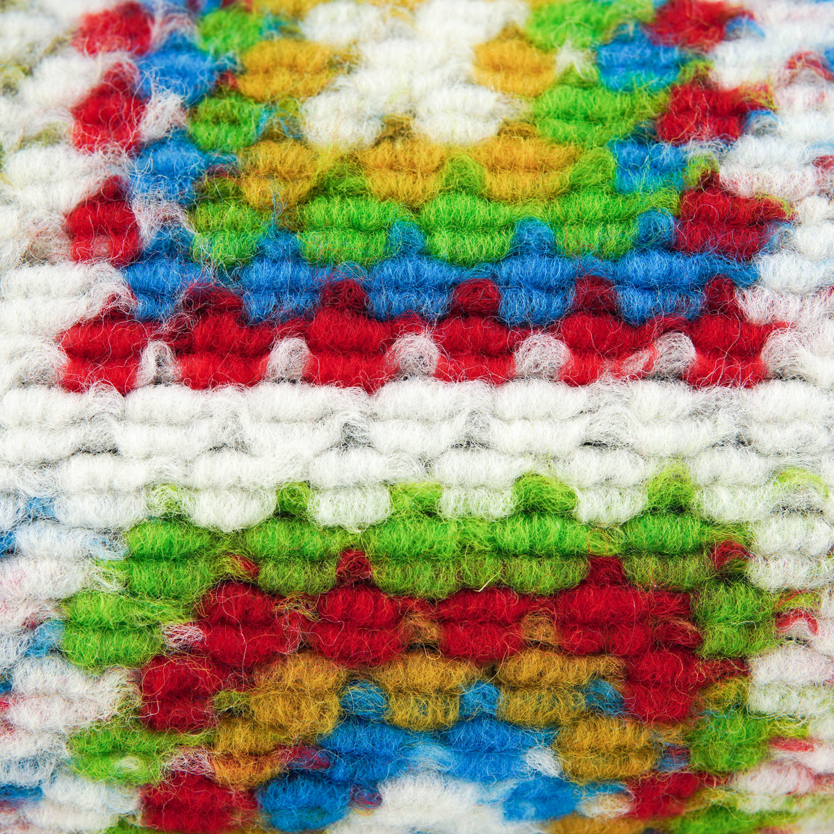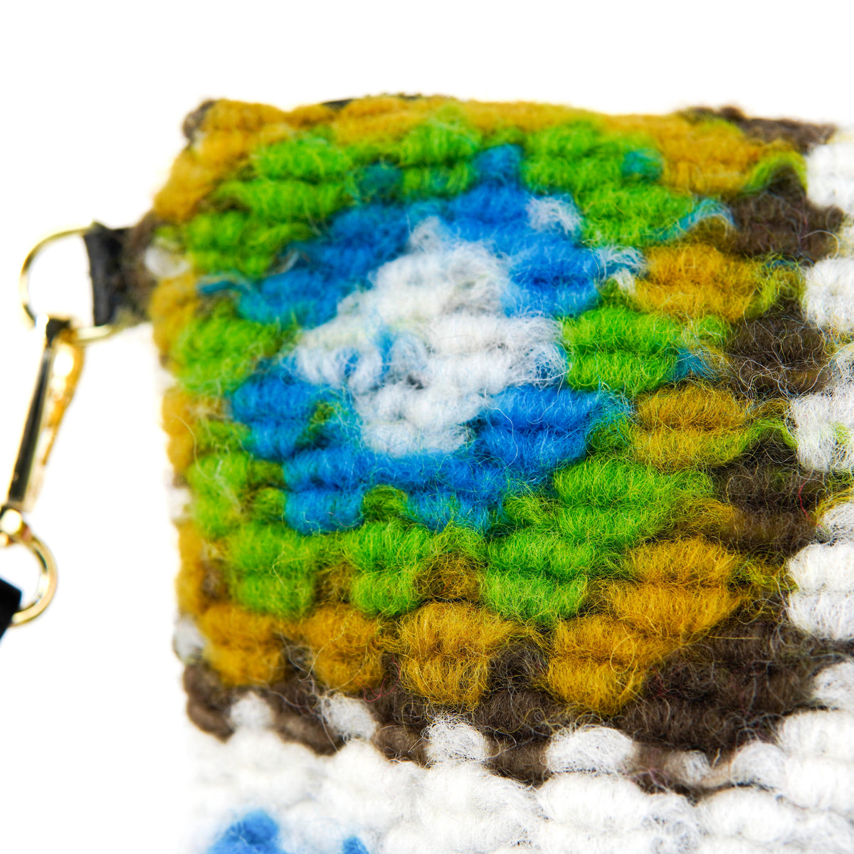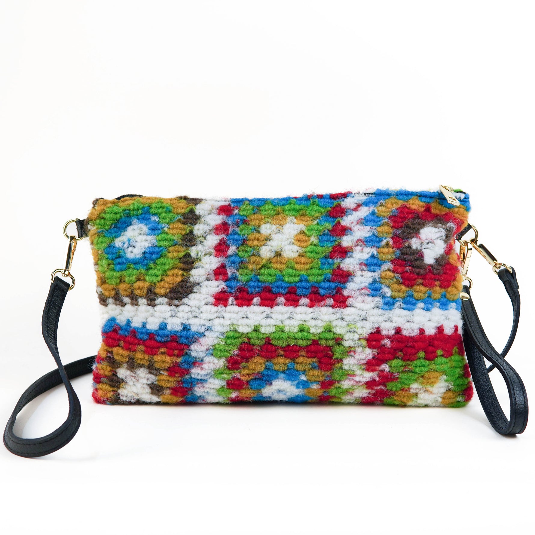Geantă plic tricotată cu model etnic și lână 9%. Curea lungă detașabilă. Închidere cu fermoar auriu. Două buzunare compartiment la interior