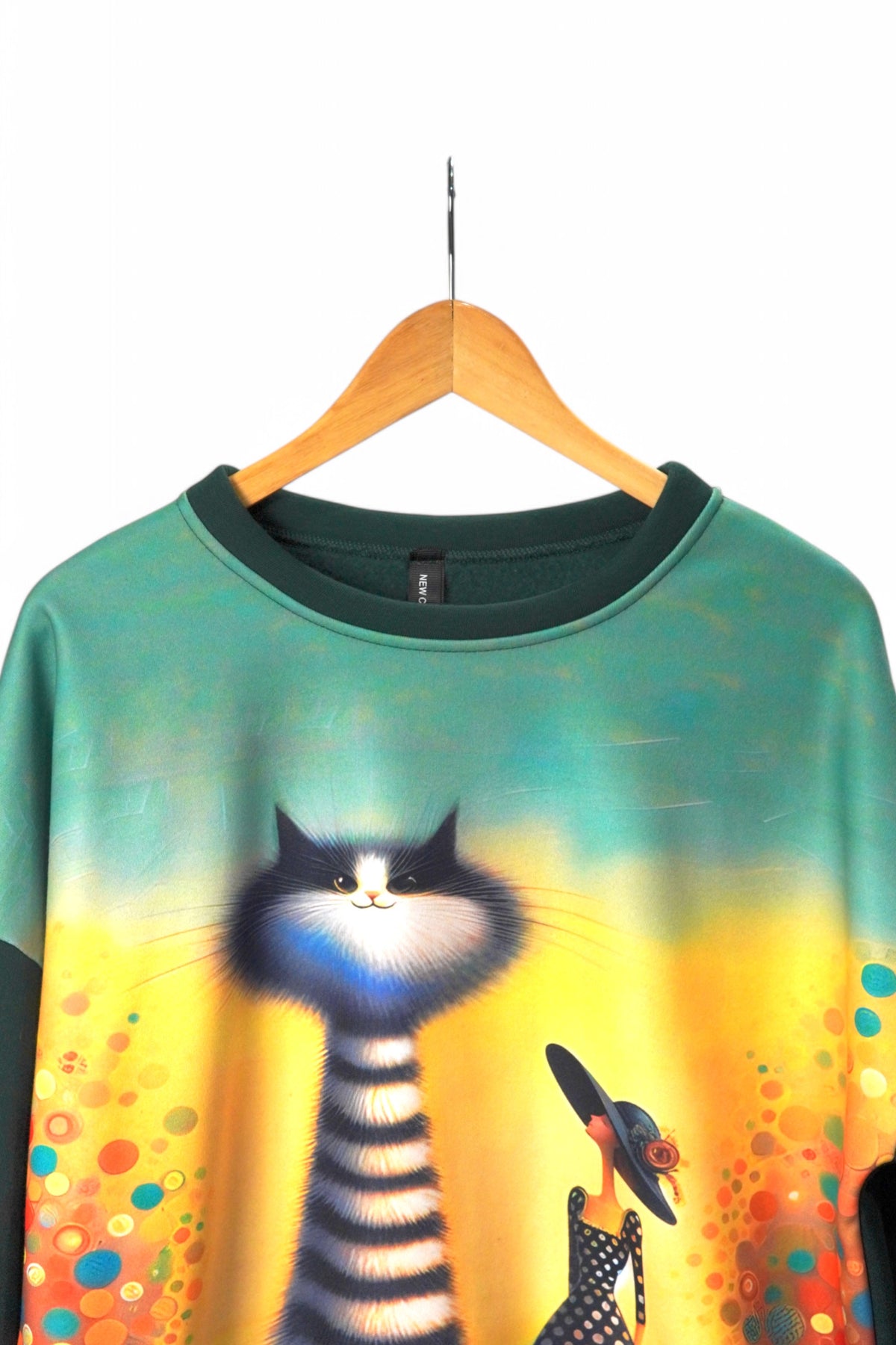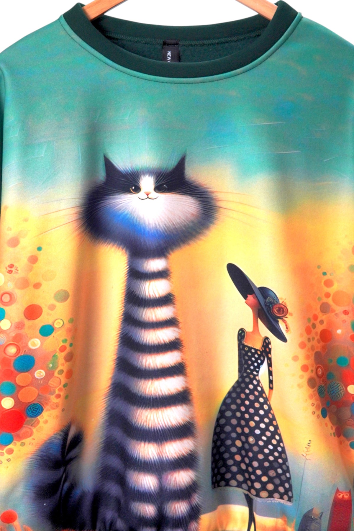 Hanorac Verde Închis Cu Imprimeu Pisică Și Femeie – Hanorac Artistic Casual