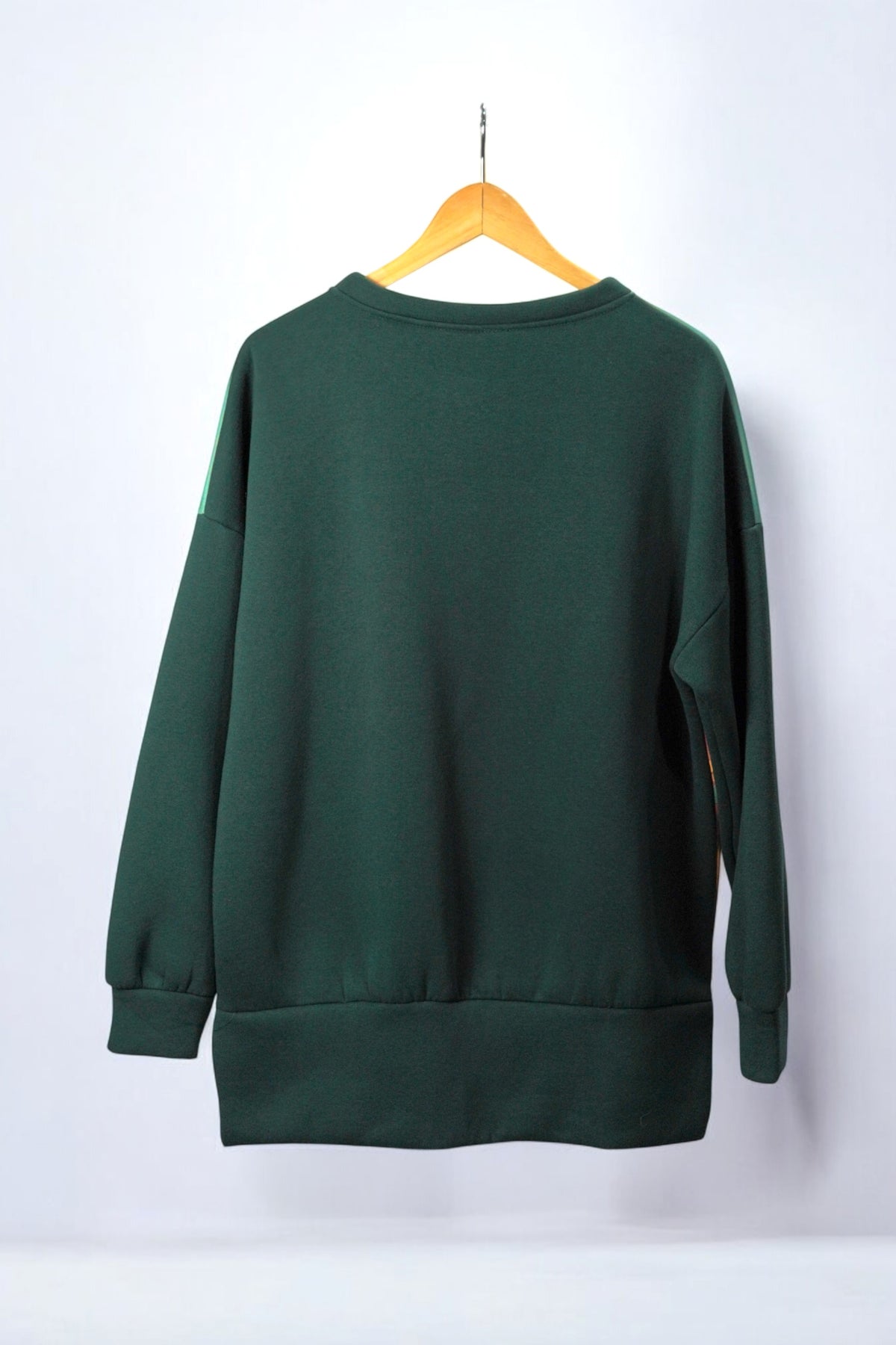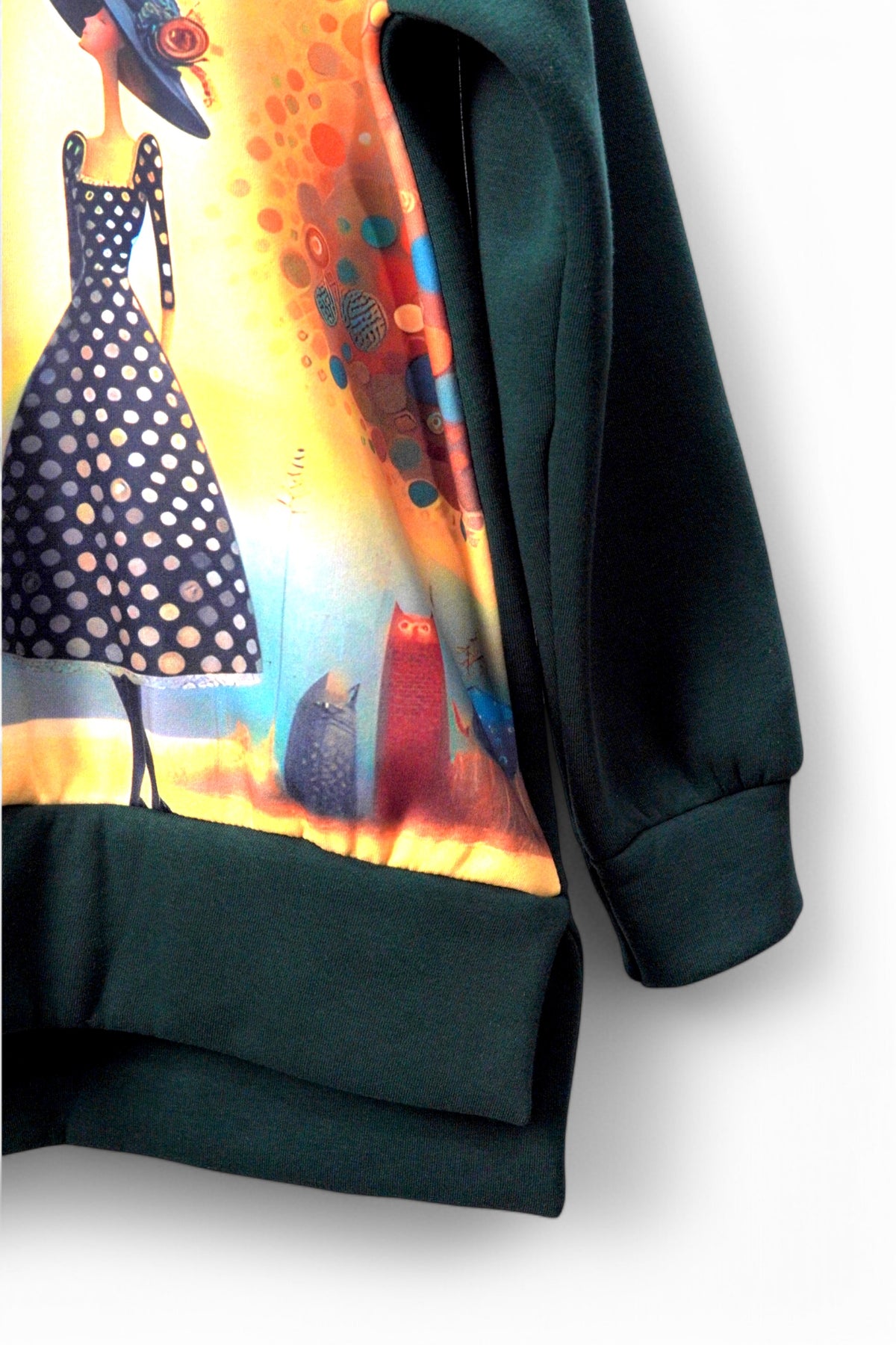 - Design: Hanorac verde închis cu imprimeu pictural reprezentând o pisică și o femeie